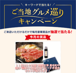ご当地グルメ巡りキャンペーンとは、毎月美味しい景品が当たるキャンペーンです。薬局店頭に掲示してあるキャンペーンチラシのQRコードを読み込んでいただき、webからチラシに記載してある店番・店名・キーワード・氏名・住所・電話番号を入力してご応募ください。キーワードは毎月変更します。